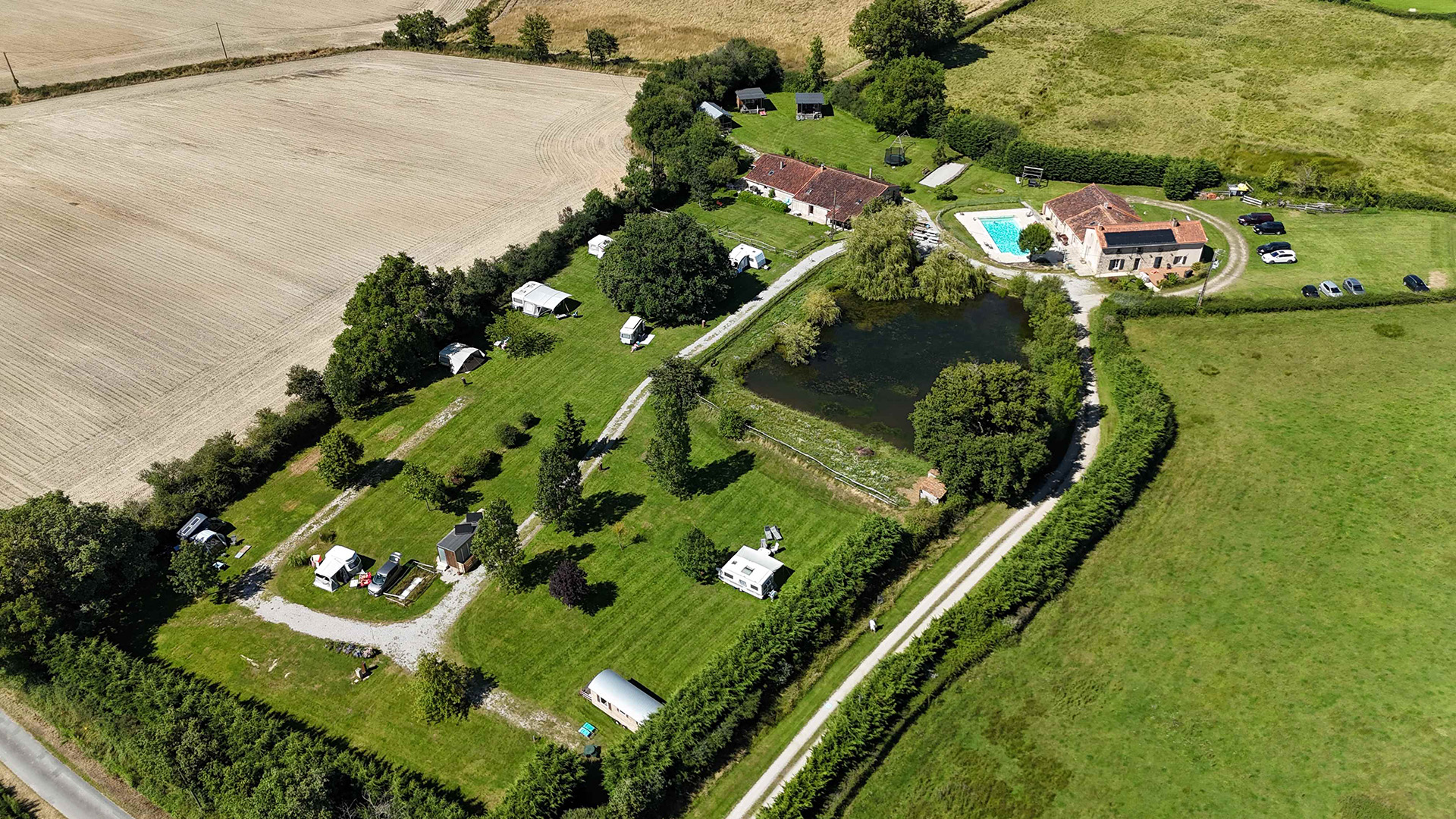 - 4 emplacements occupés par 2 cottages bois, une cabane et une roulotte
